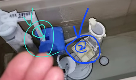 사진 중에 1번의 부품을 필밸브라고 합니다. 해당 파란색 부품은 공급관에서 물이 들어오는 것을 부구를 통해 인지하고 지정된 높이에서 물의 공급을 막는 역할을 합니다.