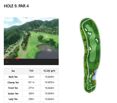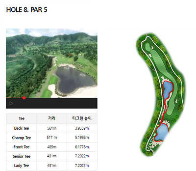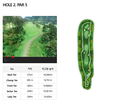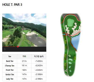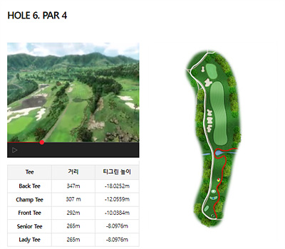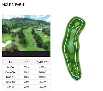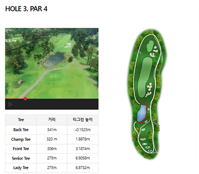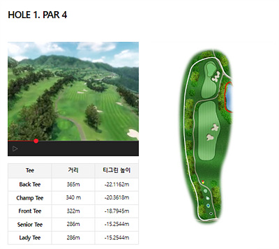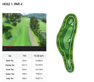 아래 홀 정보를 참고하시면 더 좋습니다. 1홀 사진을 클릭하시어 사진의 오른쪽 면을 클릭하시면 18홀 전체 정보를 순차적으로 보실 수 있으니 참고하세요. 전체적으로 코스의 양쪽이 비교적 넓어서 안정적인 플레이를 진행할 수 있습니다. 또한 적절한 해저드 및 지형지물들이 재미적인 요소를 한층 높여줍니다. 파3의 타깃 전장이 100미터 정도로 짧기 때문에 홀인원을 도전할 수 있는 재미난 코스들이 섞여있습니다. 비교적 길지 않은 전장으로 실타를 하였더라도 만회하여 좋은 점수를 세이브하기 좋은 코스입니다. 다만 OB와 해저드 지역이 많기 때문에 큰 실수를 하면 좋은 점수를 만들 수는 없습니다. 코스 난이도에 비해서 몇몇 홀들의 그린 난이도는 어려운 홀이 있습니다.