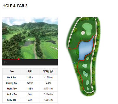 개인적으로 파3 홀 4는 양평 TPC GC LUNAR/STELLA 코스의 시그니처 코스로 프론트티 기준 106m 전장을 가지고 있으며, 중간에 워터해저드를 지나 홀인원 또는 핀빨을 느낄 수 있는 아주 재미있는 홀입니다. 바람의 방향과 홀의 위치에 따라 샌드 및 피치로 공략을 하시면 홀인원도 충분히 가능한 코스입니다.