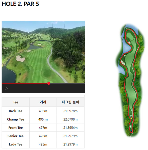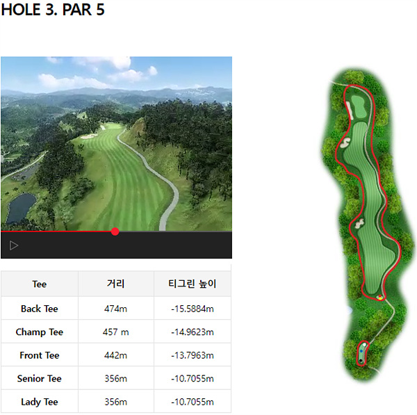 시그니처 홀은 3번 홀의 파 5 홀입니다. 아래의 사진을 보시면 아시겠지만 좁으면서 코스의 모양이 불규칙하게 이루어져 있습니다. 첫 드라이버 티샷은 무난한 페어웨이를 가지고 있지만 그다음 샷부터는 신중하게 경기를 진행하여야 합니다.
