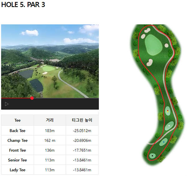 5번 홀의 파3는 프론트티 기준으로 전장거리가 136m입니다. 내리막 17미터로 구성되어 있어서 본인의 거리에 맞는 클럽보다 한 클럽 높게 잡는 것이 유리합니다. 티샷에 성공했다면 짜릿한 손맛과 함께 시원하게 뻗어져 날아가는 공을 보시며 즐거움을 느끼실 수 있는 코스입니다.