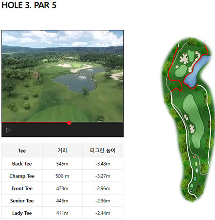 제가 생각하는 시그니처 홀은 3홀의 파 5입니다. 프론트티 기준으로 전장 473m입니다. 처음에 티샷은 무난하지만 그린 근처에서 개미허리 같은 코스 구성으로 정확한 컨트롤 샷이 요구됩니다. 워터해저드를 의식하여 만약 샷이 조금 크다면 뒤로는 깊은 벙커가 자리 잡고 있습니다.