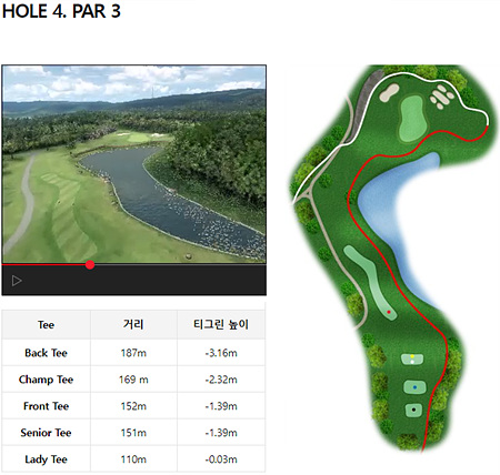 친구끼리 진행했을 때 가장 재미있었던 인상 깊은 홀은 홀 4에 파3였습니다. 우도그렉 코스의 파3이지만 프론트티 기준 152m의 전장을 가진 코스입니다.