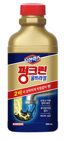 비교적 간단한 방법으로는 마트에서 쉽게 구입할 수 있는 유한 펑크린을 사용하는 것입니다. 일단 일반 락스와 달리 막힌 배수관을 뚫거나 청소 시에 사용하는 용해제입니다. 주요 성분은 정제수, 수산화나트륨, 염소계표백제 계열 차아염소산나트륨, 부식방지제 소듈실리케이트의 물질이 함유되어 있습니다.